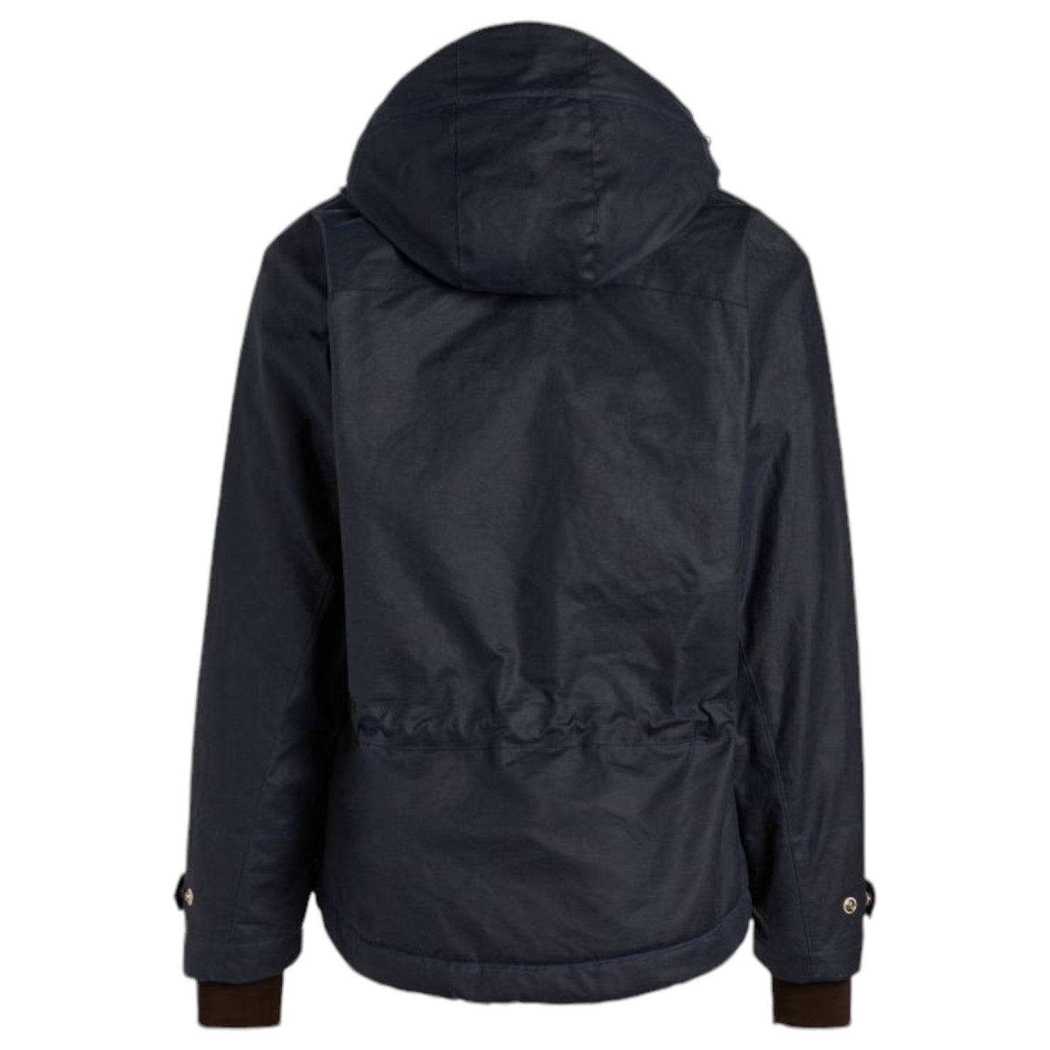 Den rymliga och omslutande huvan kan justeras med en dragsko med snörstopp i naturläder, dessutom gör en extra elastisk dragsko på baksidan av huvan att man behåller sidosikten även när huvan är på. Plagget är längre baktill än framtill.